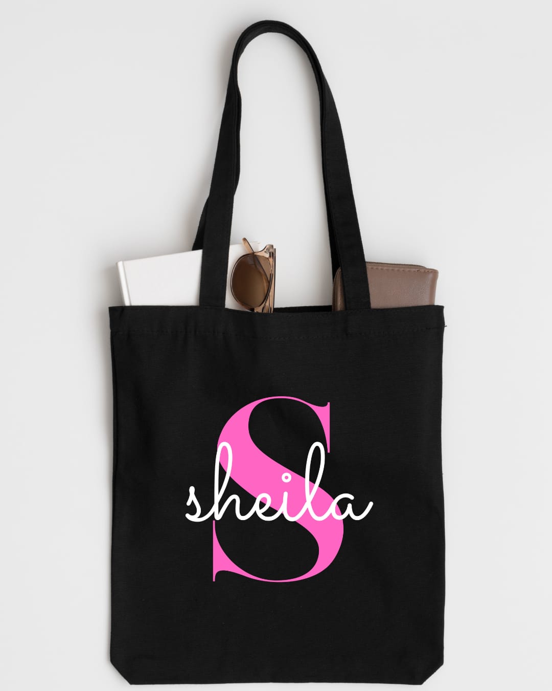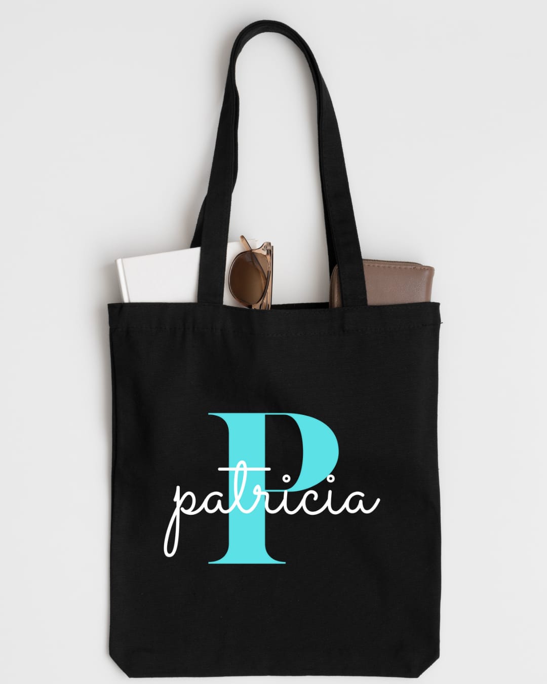 Tu inicial y nombre, con estilo. Tote resistente y única, en negro o beige, ideal para cualquier ocasión.